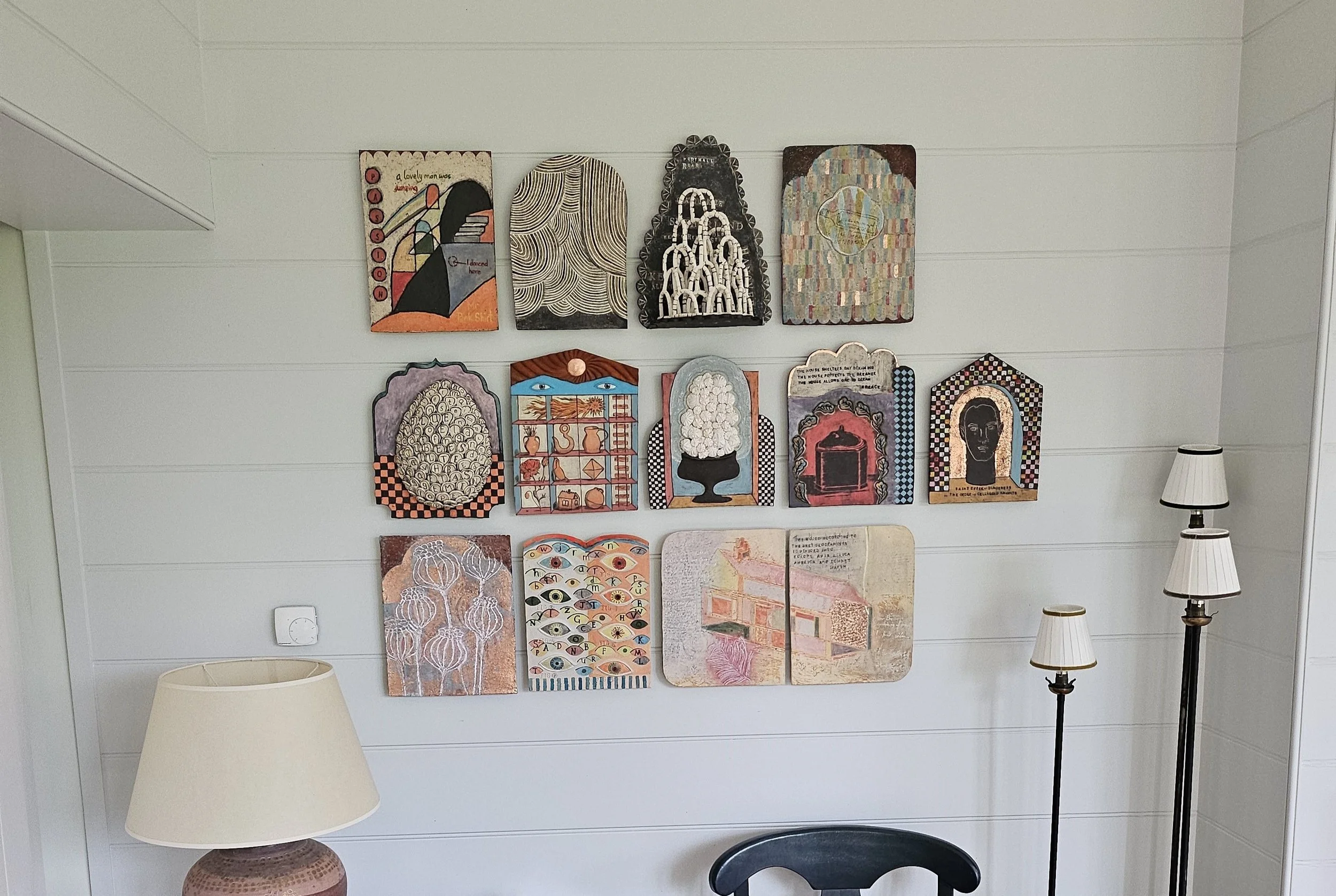 This wall piece consists of 13 ceramic panels that feature images of Brighton that are personal to me and images of Dungeness and Prospect Cottage. They feature a range of styles and techniques from inlay, sgraffito, hand painting, slab building and mono printing. The whole panel is approx 1.3 m wide.